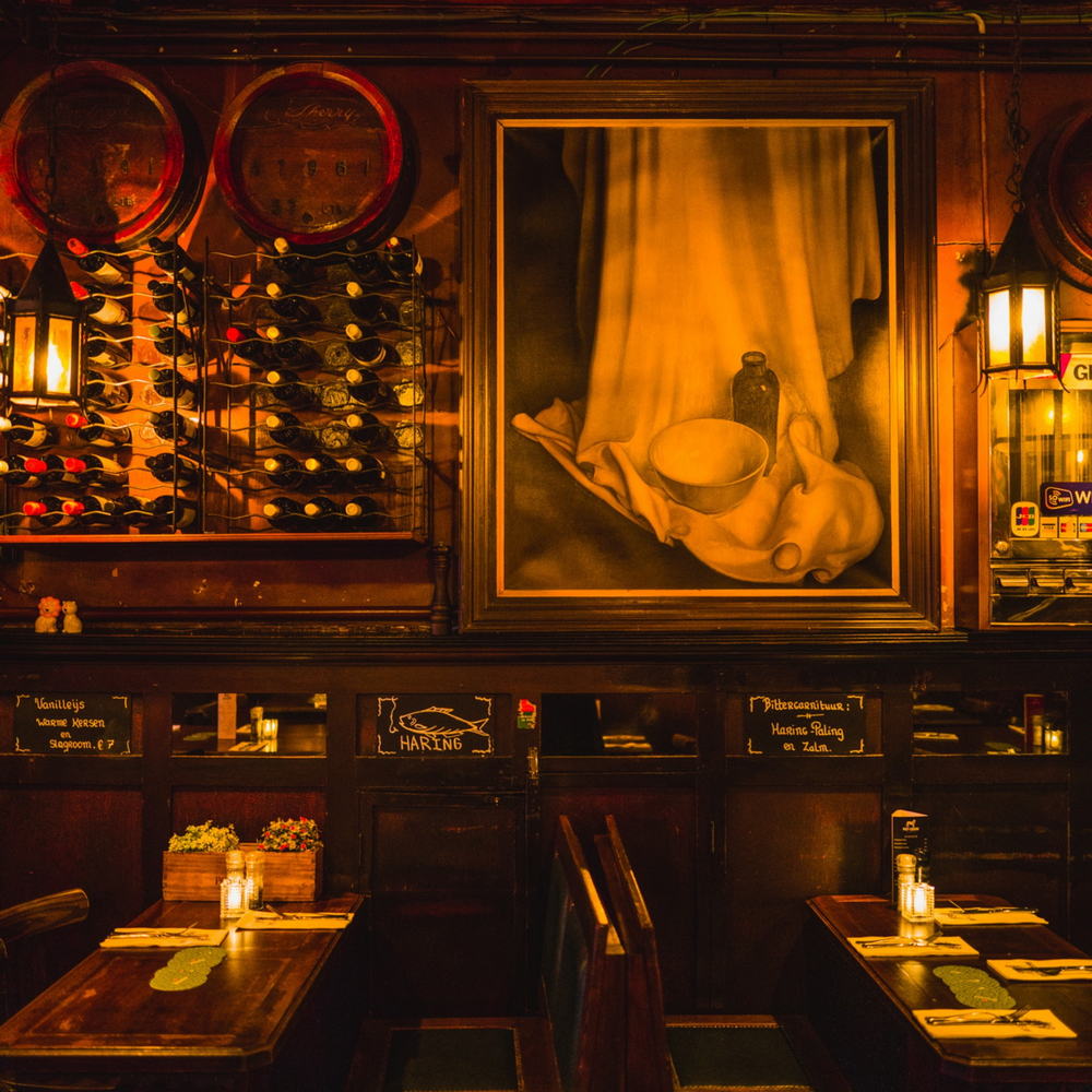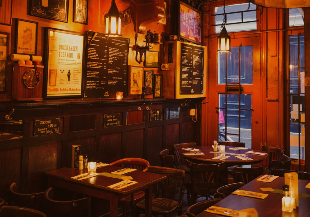 Onze interieurs ademen authenticiteit met hun houten meubilair, karakteristieke vloerplanken en glimmende bierpompen. Op de lambrisering prijken nog steeds de jeneverkruiken, terwijl het plafond gesierd wordt door olieverfschilderingen, glas-in-loodramen en smeedijzeren lampen. Een aantal schilderijen en talloze foto’s van gasten die ooit gezelligheid vonden bij Piet de Leeuw vullen de muren.