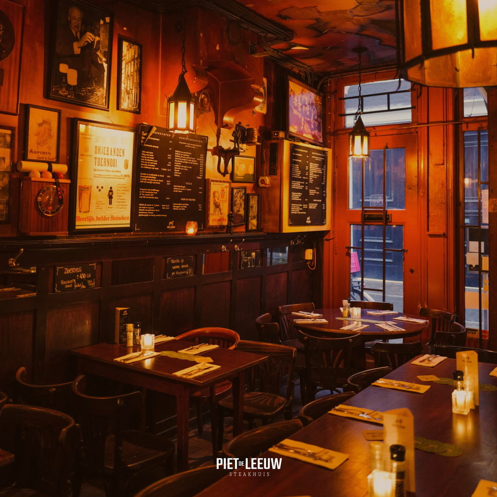 Piet de Leeuw, het gezelligste steakhuis in het centrum van Amsterdam. Heerlijk eten in een authentiek interieur.